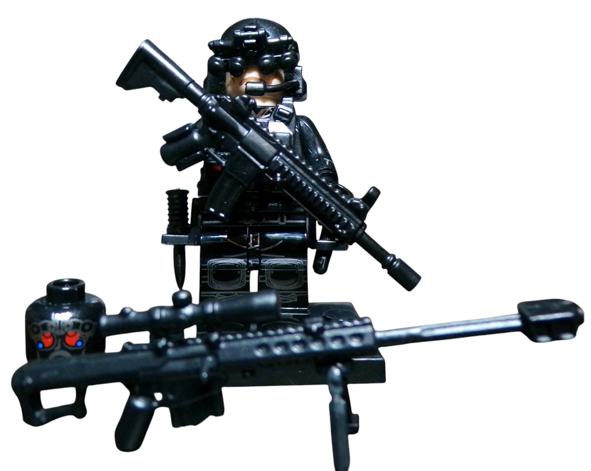 SAS: Get ready for the ultimate in battle play with the SAS Minifigure! Equipped with a machine gun, sniper rifle, commando knife, grenade, and pistol, this British special forces soldier is ready for any mission. Plus, with night vision goggles, you'll have the upper hand in any low light situation. Compatible with all Brands.